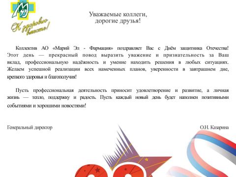АО "МАРИЙ ЭЛ-ФАРМАЦИЯ" ПОЗДРАВЛЯЕТ ВАС С ДНЕМ ЗАЩИТНИКА ОТЕЧЕСТВА!